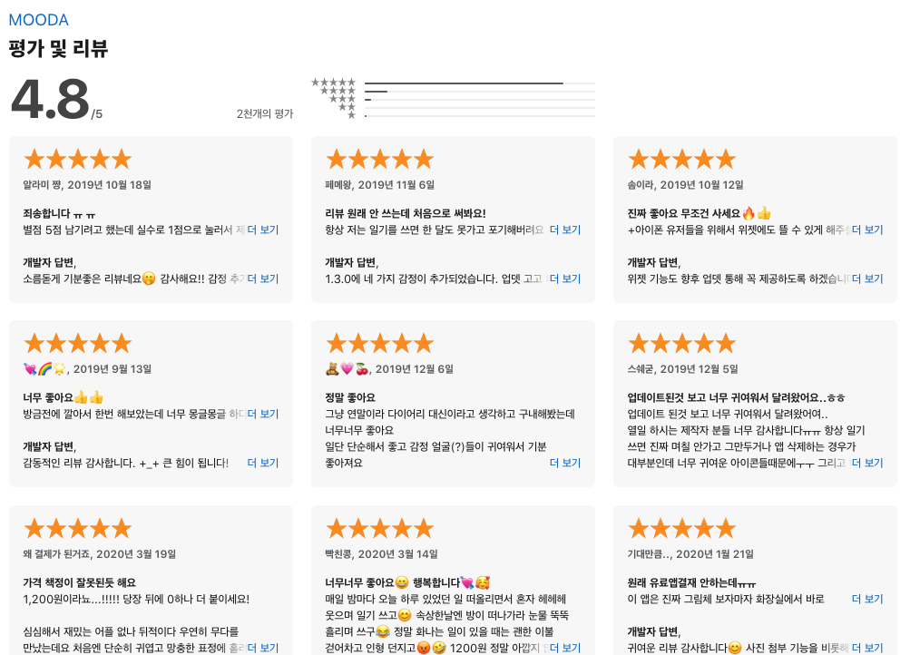 앞서 언급했듯, 앱스토어에서 상당한 호평을 받고 있는 앱이다보니 좋은 리뷰들도 여러 건 남아있네요. 특히 “감정표현이 더 늘어나지 않았으면 좋겠다”면서, “지금과 같은 단순함이 너무 좋다”는 리뷰가 눈에 띕니다. 또 “항상 일기를 써도 한 달도 못 가지만 이 앱은 짧게 짧게 작성하기 좋은 것 같다”는 리뷰도 있군요?