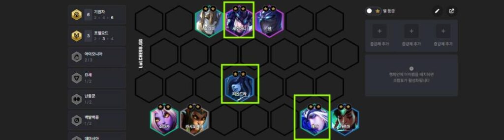 보통 롤토체스를 진행하면서 8레벨까지 달성하기가 다소 어려운 면이 있지만, 현재 경험치 증강이 있기 때문에 8레벨까지는 무리없이 진행할 수가 있을텐데요. 이 점을 활용하여 프렐요드에 해당하는 애쉬와 세주아니도 모아주도록 합니다. 챔피언이 잘 나오지 않는다면 다른 활성 가능 특성을 활용하면서 나올 때까지 기다리고 버티는 식으로 운영해야 합니다. 리롤을 할 경우 10레벨 도달이 어려울 수 있기 때문에 운영이 필요합니다.