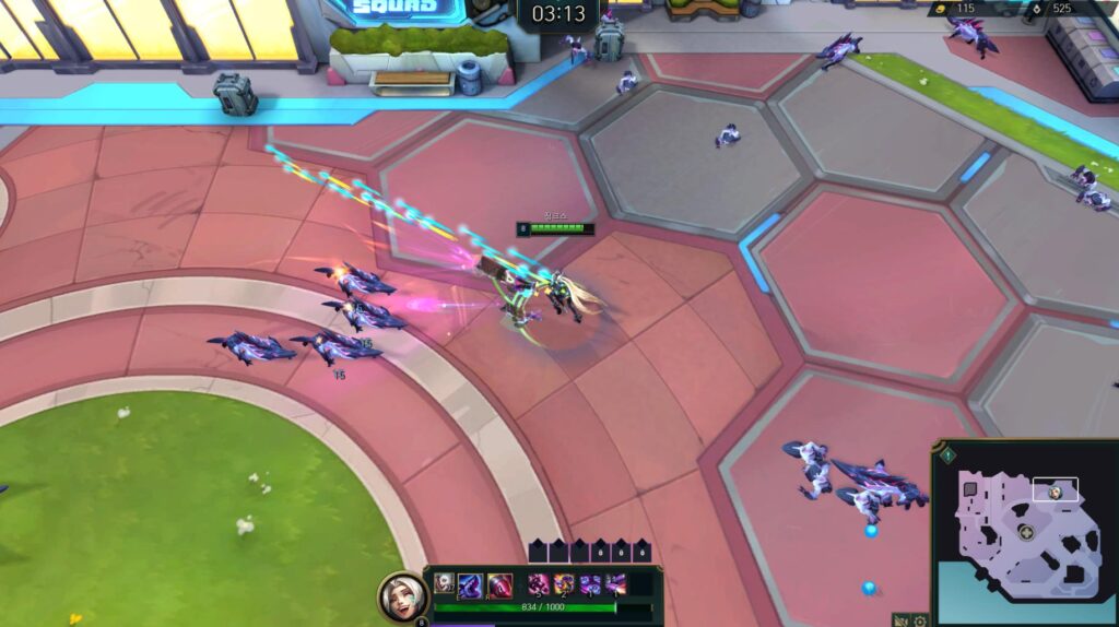 롤이랑 똑같습니다. 집중포화 모드에서도 스킬 쿨타임을 계산해서 사용하시는 게 좋습니다. 쿨타임이 짧아 자주 쓸 수 있는 스킬, 예를 들어 징크스의 ‘E’ 스킬 같은 경우에는 자주 써주도록 하고, R키처럼 쿨타임이 긴 경우는 미니 보스나 플레이어를 위태롭게 하는 유닛들이 많을 때 써주도록 합니다.