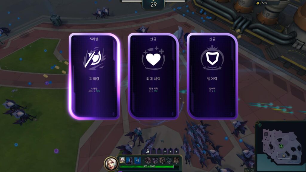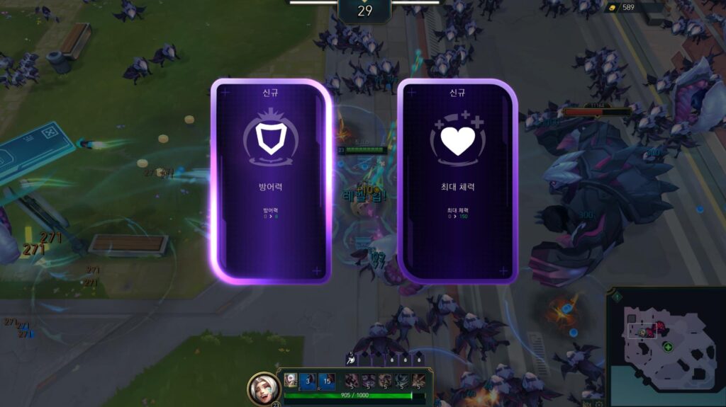 무기 강화가 끝나면 그 다음 순서는 당연히 챔피언의 능력치 강화겠죠. 이번 롤 집중포화 공략은 뱀서류 게임이라는 특성을 고려하여, 컨트롤에 집중하였는데요. 때문에 ‘피해량’을 반드시 우선적으로 강화시켜서 챔피언의 단일 데미지를 강화시켜주도록 해주세요.