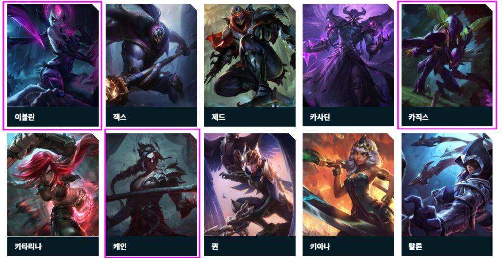 때문에 은신 + 점멸 + 궁극기 이렇게 탈출기가 3개라고 볼 수 있습니다. 카직스와 케인도 비슷합니다. 카직스는 날아서 벽을 넘을 수 있고, 케인은 챔피언 자체가 벽 사이를 이동하는 스킬을 지녔습니다.