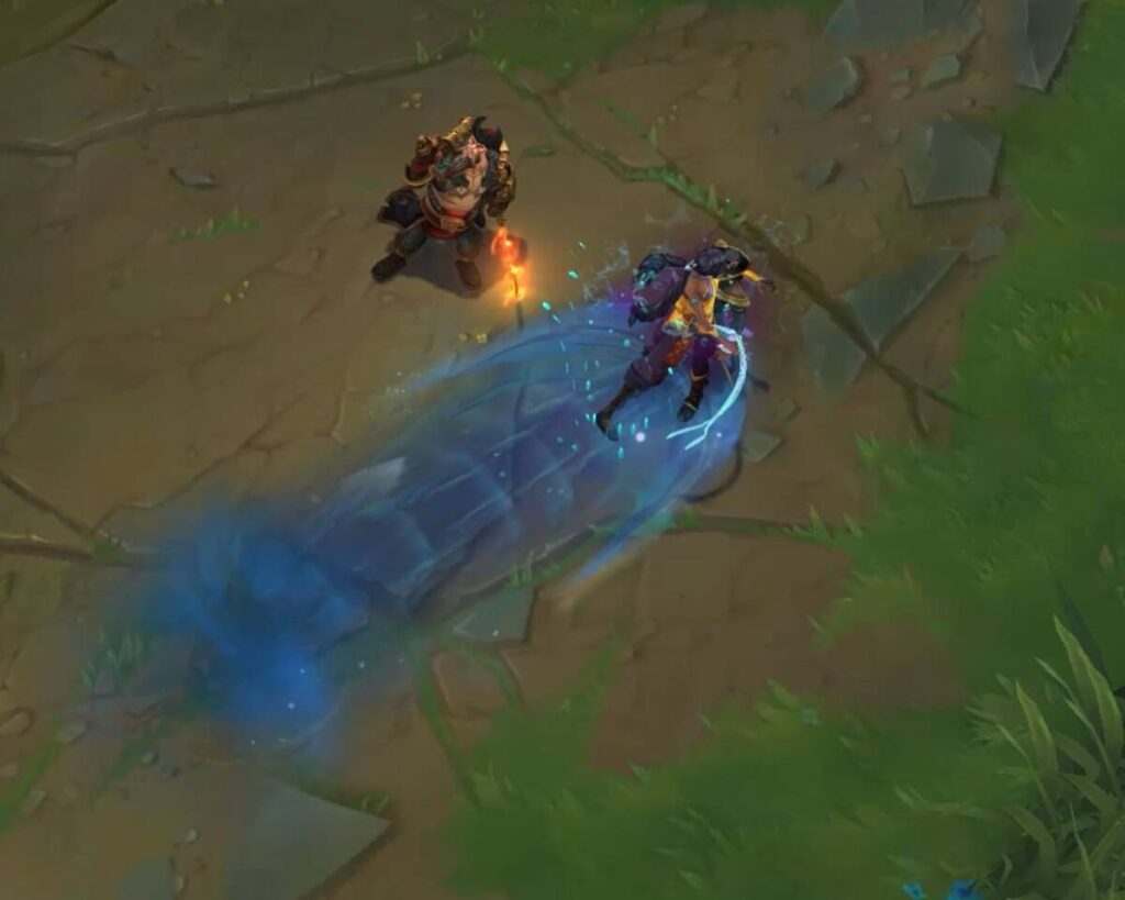 마찬가지로 사미라의 E스킬과 흡사한 이동기이다. 다만, 특이한 점은 야스오의 EQ콤보처럼 E스킬을 사용하면서 Q스킬을 쓰면 Q스킬이 변형되어 발동한다. 이 때, 스킬이 맞추기 더 쉬운 형태로 변하는데 앞서 말했듯이 Q스킬이 딜교환에 굉장히 중요한 스킬이기 때문에 확정적인 딜교환을 원한다면 EQ콤보를 많이 사용하게 될 듯 하다.