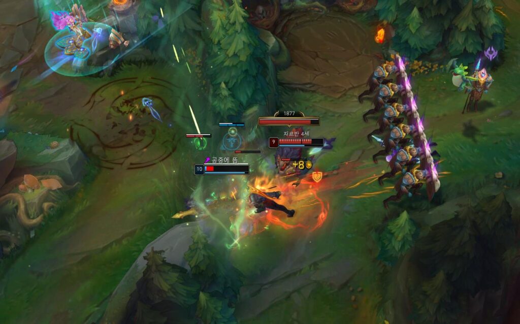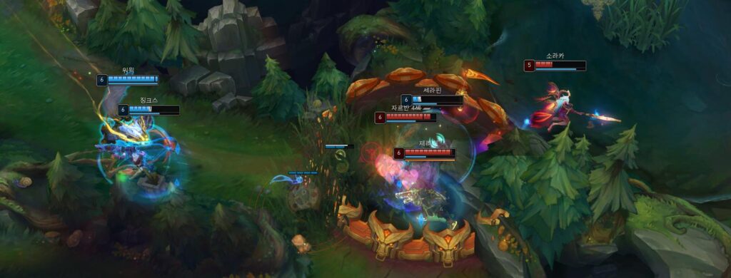 특히 위 사진처럼 W 스킬로 적에게 둔화를 주고 아군의 지원을 기다릴 수 있는데요. 만약 적이 맞 교전을 한다고 해도 쉴드가 있기 때문에 피해가 비교적 적습니다. 하여, 이 롤 정글 챔피언의 꽃이 되는 스킬 중에 하나라고 볼 수 있는데요. 초반에는 미미한 듯한 효과를 보이지만 시간이 지날수록 상당히 성가신 스킬이 됩니다.