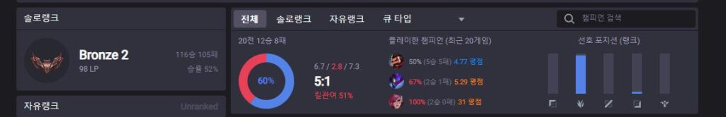 위 유저 같은 경우 티어에 비해서 굉장히 좋은 퍼포먼스를 보여주고 있지만 승률은 좋지 않습니다. 최근에 추가된 옵지 스코어만 단순히 놓고 보더라도 더 올라갈 수 있는 것이 보이죠. 그렇다면 올라가지 못하는 이유는 무엇일까요? 그렇습니다. 이 유저는 거의 100판 정도를 듀오 플레이를 하였습니다.