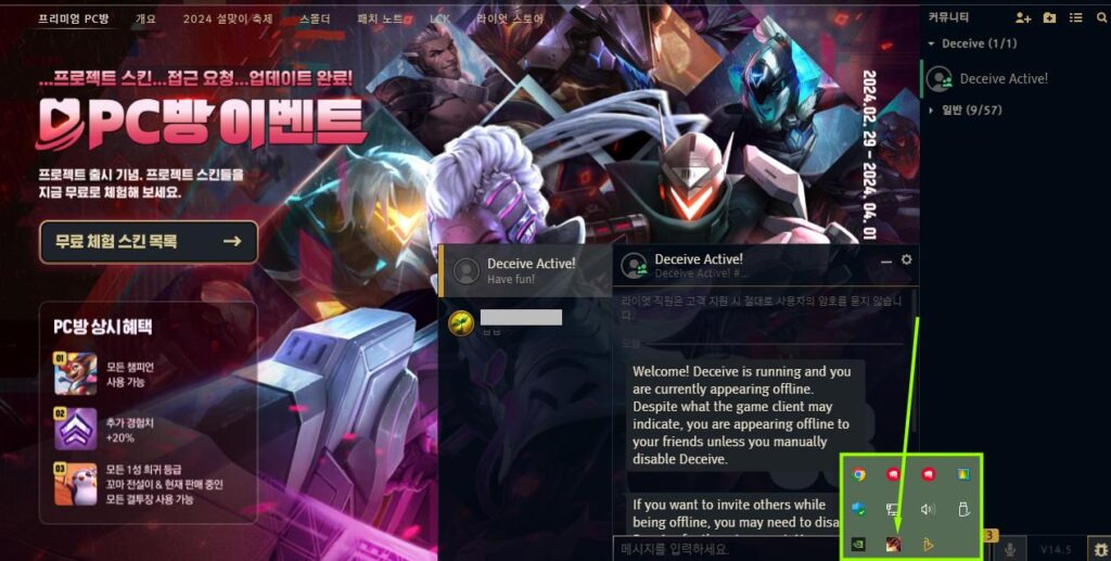 만약 누군가를 초대해서 같이 하려는 상황에 잘 안되신다면 이 때에는 잠시 비활성화 해주셔야 합니다. 위 사진처럼 시스템 트레이를 눌러서 Deceive의 아이콘을 눌러주시면 작동 유무에 대해 확인하실 수가 있는데요. 롤 오프라인 모드를 잠시 비활성화 해주신 뒤, 다시 초대해주시면 됩니다.