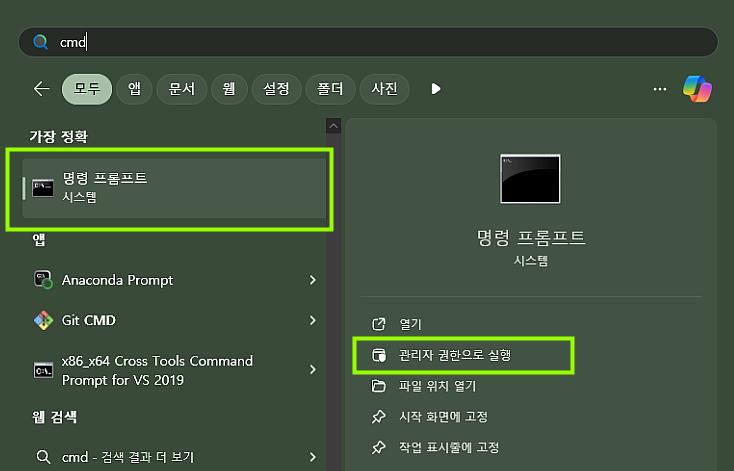 • 3. 이 때 명령 프롬프트 실행은 반드시 ‘관리자 권한으로 실행’ 하셔야 합니다!