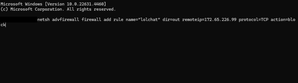 명령어 : netsh advfirewall firewall add rule name="lolchat" dir=out remoteip=172.65.226.99 protocol=TCP action=block