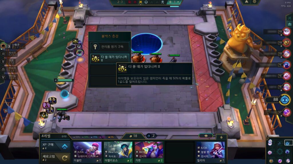 보통은 이자 5원을 받을 때까지 모은 뒤, 한 방에 방출하는 식으로 플레이 하는 이들이 많은데요. 이렇게 될 경우 1,2코인 챔피언들이 약한 모습을 보일 가능성이 대단히 높아져서 후반에 임박할수록 불리해지는 경우가 많습니다.