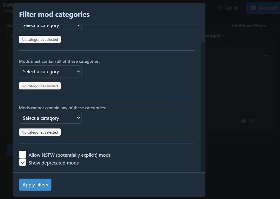 위에서 소개한 모드처럼 간혹 업데이트가 중단된 모드는 검색되지 않는 경우가 있습니다. 그럴 때에는 필터를 클릭해주세요. 위 사진처럼 필터창이 나타나면가장 아래에서 보이는 ‘Show deprecated mods’에 체크해주시면 됩니다. 업데이트가 중단된 모드도 볼 수 있게 해주는 필터이니 반드시 설정해주셔야 다른 모드들도 보이게 된답니다. (리썰 컴퍼니의 업데이트로 인해 몇몇 모드는 이후에 호환되지 않을 가능성도 존재합니다.)
