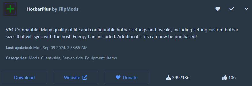 HotbarPlus 모드는 인벤토리를 늘려주는 창입니다. 설정에 따라서 인벤토리의 칸수가 늘어나는 방식인데요. 너무 많은 설정값은 게임의 재미를 해칠 수 있기 때문에 6칸 정도로 사용하시는 것을 추천드립니다. 이외에도 여러 가지 편의성이 첨가된 모드이기 때문에 이 모드 또한 기본이라고 볼 수 있겠습니다!