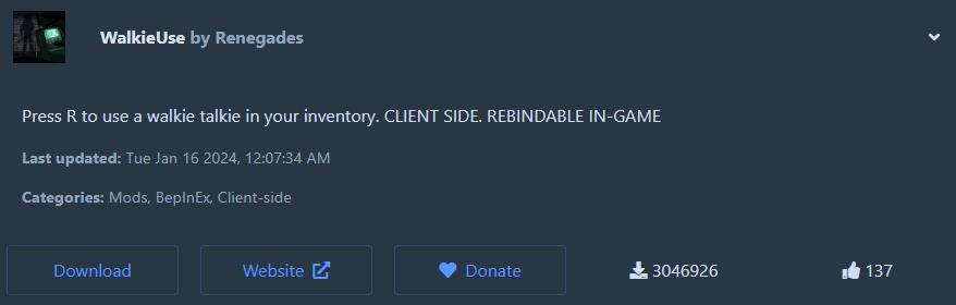 WalkieUse 모드도 앞서 설명한 모드와 마찬가지로, 간편함을 제공하는 모드입니다. 해당 모드는 R키를 누르고 있으면 워키토키를 사용할 수 있게 해주는 모드입니다. 해당 모드 또한 조작키를 자유롭게 설정할 수 있다는 이점을 가지고 있습니다. 더불어, 아이템을 손에 쥔 상태임에도 불구하고 사용할 수 있다는 이점이 있어요. 게임을 하다 보면 급박한 상황들이 정말 많으니 해당 모드도 기본이라고 할 수 있겠습니다!