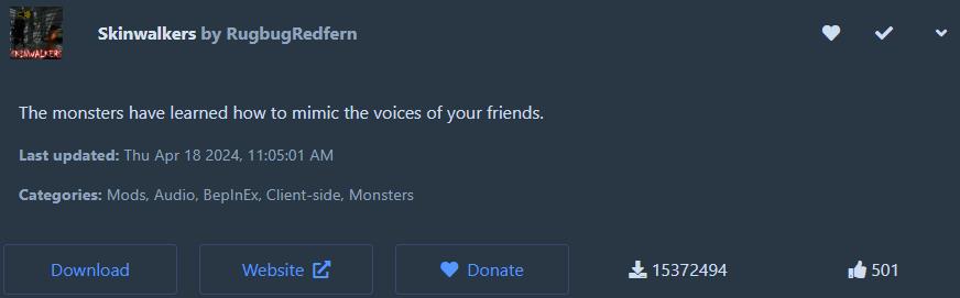 Skinwalkers 모드입니다. 이 모드는 정말 유명하죠? 일명, 장산범 모드라고도 불리는 모드인데요. 리썰 컴퍼니 모드 추천 중에서는 부가적인 축에 속하기 때문에 기본까지는 아닙니다. 하지만 재미를 위해서 설치하시는 것을 권해드려요. 해당 모드는 ‘친구의 목소리’를 따라하는 몬스터가 등장하는 모드인데요. 친구가 말하는 것을 그대로 따라한다는 특징이 있어서 게임의 재미가 배가 되곤 합니다!
