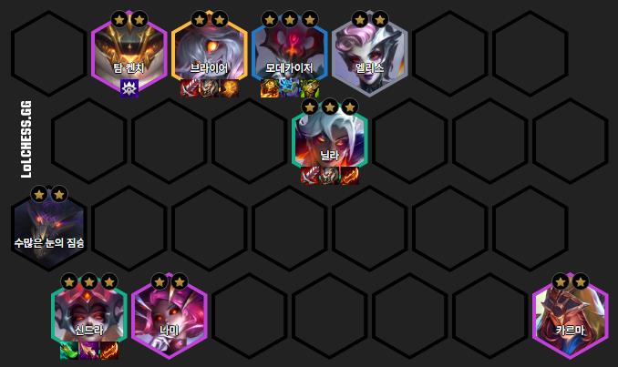 앞서 살펴본 롤토체스 증강처럼 비슷한 맥락에 있는 방식입니다. 그러나 차이점이 있다면 신드라나 나미 사용이 조금 어려울 경우, 2-3성작이 잘 되지 않을 때에 시도해볼만한 덱 구성이라고 볼 수 있을 것 같습니다.