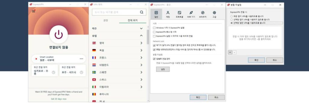 추가적으로, 익스프레스VPN 같은 경우 ‘분할 터널링’ 이라는 탁월한 기능을 제공하기 때문에 자신이 VPN 을 적용하고 싶은 프로그램에만 단독적으로 적용할 수 있습니다.