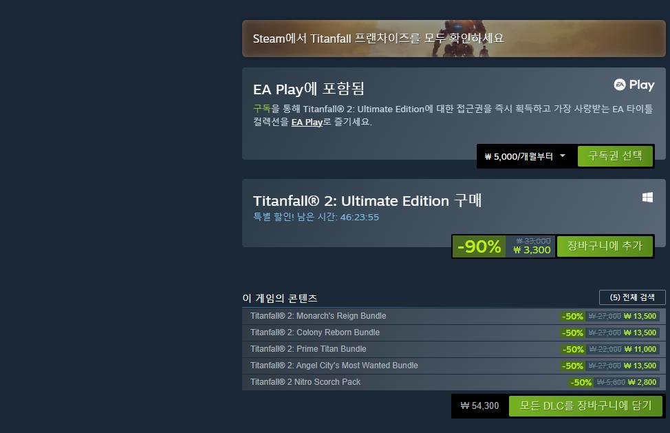 추가로, 1,700원을 보태서 5,000원에 EA Play를 구독할 수도 있는데요. 게임을 소장할 수는 없지만 EA에 등록되어 있는 여러 가지 게임들을 마음껏 한 달 동안 플레이 할 수 있기 때문에 이 방법도 고려해보시면 좋을 것 같습니다. 왜냐하면 타이탄폴이 아무리 재밌어도 신작게임이 아니기 때문에 몇 개월 이상 지속되기는 어려우니까요! 그러니 차라리 5,000원에 여러 가지 찍어먹어 보는 게 좋을 수도 있습니다.