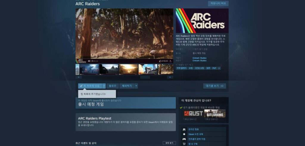 아크 레이더스 테스트 신청 방법은 스팀에서 ‘ARC Raiders’ 검색 후, 하단에 ‘권한 요청’ 을 누르시면 됩니다. 위 사진처럼 상점에서 게임명을 검색하면 하단에 초록색으로 나타나는데요. 이미 신청하신 분들은 사진처럼 ‘접근 권한을 요청했습니다!’ 라는 문구를 보실 수 있습니다. 테스터로 선정되는 경우, 자동으로 라이브러리에 생성되거나 이메일로 연락이 오니 기다리셨다가 플레이 해보시면 됩니다.
