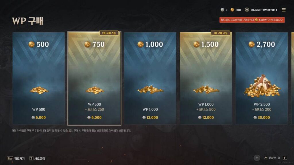 제일 중요한 부분은 단연코 가격이라고 생각합니다. 워헤이븐 월드패스 구매를 위해서는 950WP가 필요하다고 앞에서 말씀 드렸었는데요. 넥슨 캐쉬로 대략 12,000원에 해당하는 가격입니다. 하지만 현재 이벤트를 진행하고 있기 때문에 조금이나마 보탬이 될 수 있는 WP를 받을 수가 있는데요. 여기에 500WP 상품을 구매하게 되면 패스권을 구매할 수 있게 됩니다. 왜냐하면, 500WP는 현재 행사중으로 250WP를 보너스로 증정하여 총합 750WP로 맞춰주기 때문인데요.