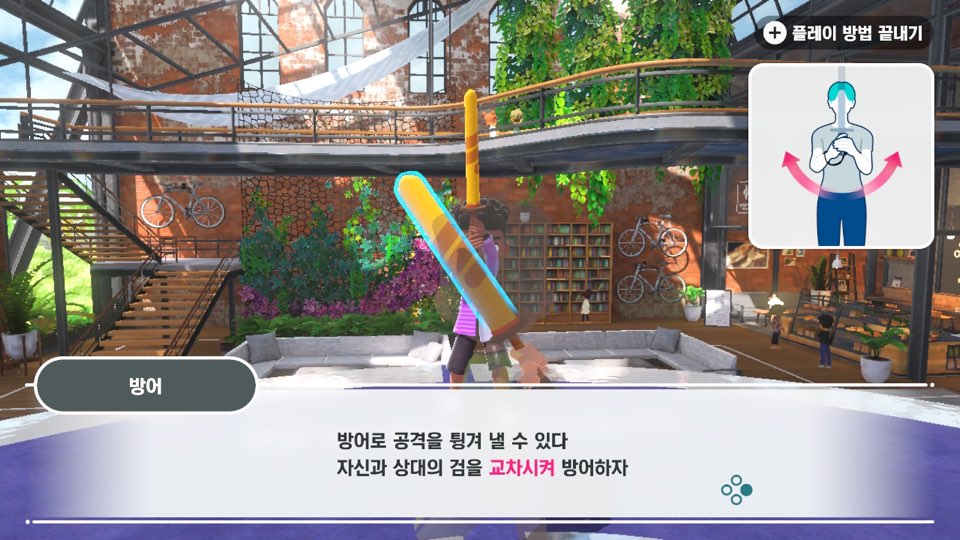 사실 검술은 플레이하기 전까지는 그닥 기대하지 않았던 종목이었는데, 생각보다 너무 재미있고 웃겼던 게임이었어요. 조이콘을 검으로 사용하여 상대방을 장외로 떨어트리면 승리하며, 공격과 방어가 가능합니다.