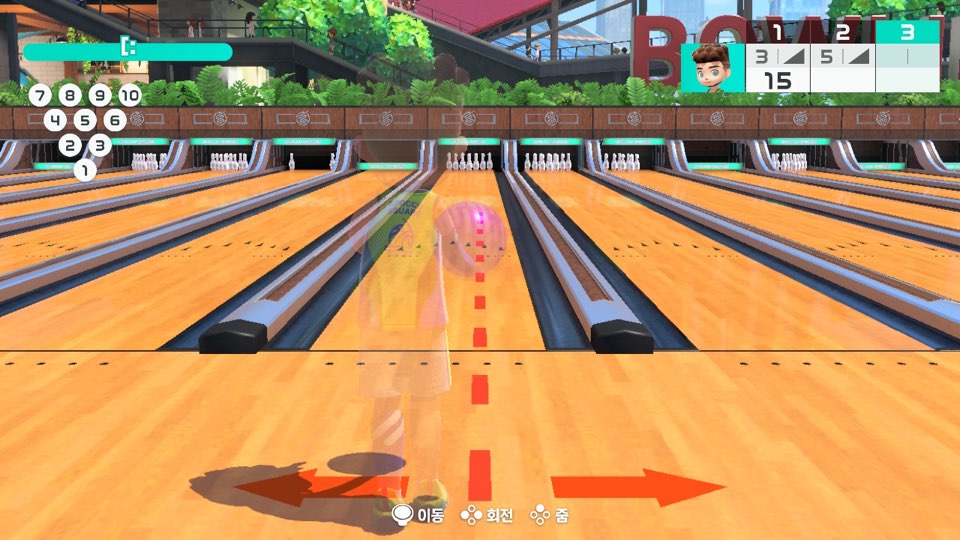 볼링은 플레이하면서 가장 재미있었던 종목인데요. 조이콘 1개를 사용하여 번갈아가며 플레이하게 됩니다. 저는 ‘스탠더드’ 모드로 플레이했습니다. 단조로워 보이지만 조이콘을 활용해 커브(훅 볼)를 넣을 수도 있어 은근 재미있어요.