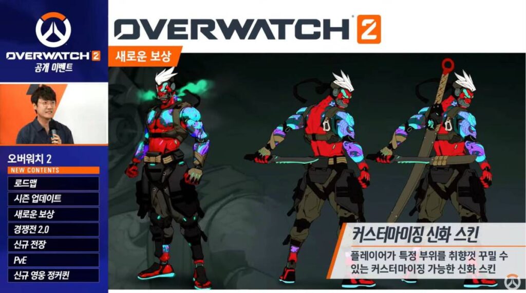 아무래도 오버워치 1의 영웅들은 다양한 스킨이 있다고 해도 개성을 갖추기는 어려웠다. 하지만, 2부터는 나만의 커스터마이징이 가능한 신화 스킨이 제공된다. 이를 통해 게임 안에서도 독특한 나만의 개성을 드러낼 수 있게 되었다. 뿐만 아니라, 무기 장식이라는 새로운 액새서리도 공개되었는데 생각보다 매니악한 콘텐츠도 생겨난 것을 보니 블리자드가 꽤나 고민을 한 흔적이 드러난 듯하다.