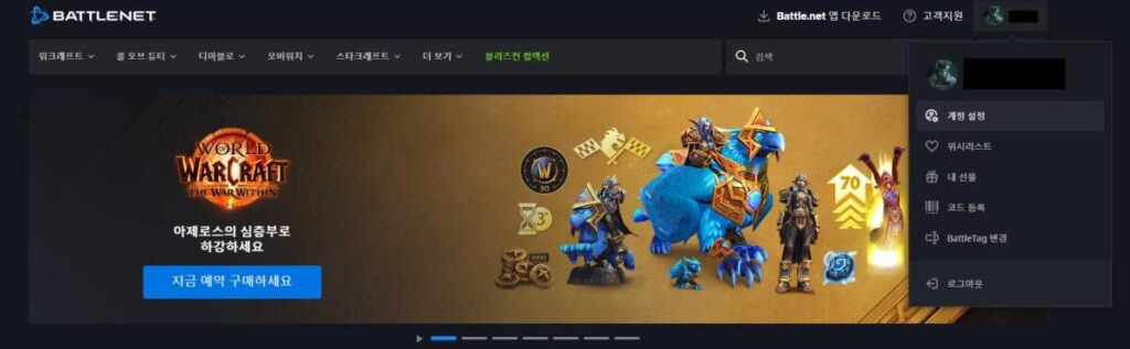 연동 방법은 대단히 쉽습니다. 먼저 배틀넷 홈페이지를 들어가서 자신이 연동할 아이디로 로그인 하도록 합니다. 그 후, 위 사진처럼 오른쪽 위 자신의 프로필을 누르면 ‘계정 설정’ 이라는 버튼이 보이실 것입니다.