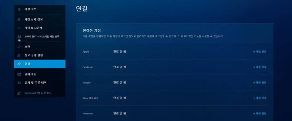 돌아가서, 앞전에 설명처럼 계정 설정을 클릭하면 위 사진과 같은 화면이 나타날텐데요. 왼쪽의 다양한 탭들 중에서 ‘연결’ 버튼을 눌러주시면 됩니다. 그러면 사진처럼 애플, 페이스북, 구글 등 다양한 플랫폼과 연결할 수 있음을 확인하실 수가 있습니다.