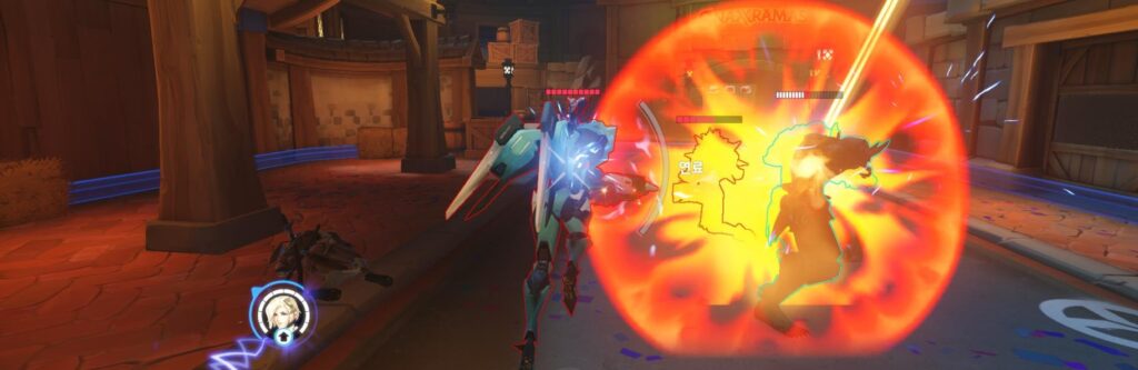 위 사진은 둠피스트가 돌진기를 사용하자마자 충격탄을 쏴서 고립시키는 모습인데요. 둠피스트 뿐만 아니라 라인하르트, 윈스턴, 레킹볼 등이 특정 의도를 가지고 움직이는 것을 방해할 수 있습니다. 탱커가 1명으로 줄어든 오버워치2 에서는 상당히 부담스러운 상황이죠.