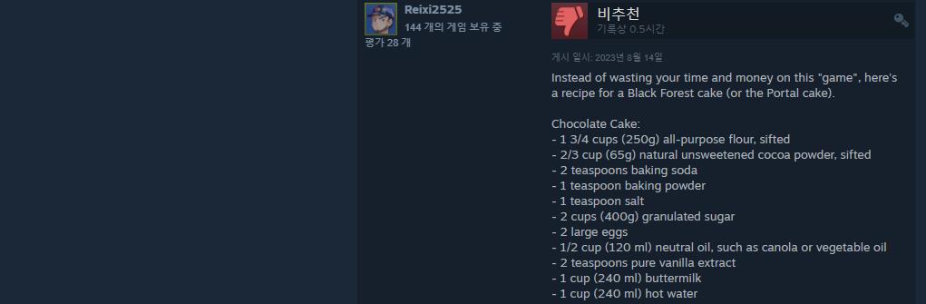 현재 오버워치 2 리뷰란은 그야말로 아수라장입니다. 언어와 국가를 따지지 않고 대다수의 유저들이 게임을 강하게 비판하고 있고, 심지어는 엄청난 인신공격과 함께 블리자드를 조롱하는 글도 매우 쉽게 찾아볼 수 있습니다. 그리고 위 사진은 어느 외국 유저의 리뷰인데요. 케이크 레시피를 공유하기만 했을 뿐인데 다른 유저들의 추천을 매우 많이 받아서 상위 노출 되고 있는 상황입니다. 이렇게 코멘트란에 레시피를 공유하여 조롱하는 것은 사실 매우 흔한 일입니다.