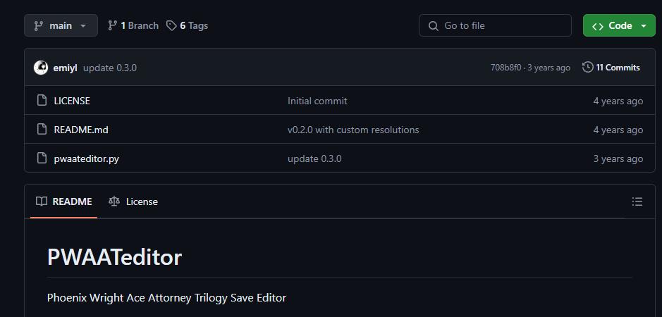 위 주소로 가시면 emiyl이라는 사용자가 만든 세이브파일 에디터에 접근하실 수 있습니다. 에디터는 파이썬 언어를 이용하기 때문에 설치한 것이었는데요. 사진상으로 오른쪽 위 초록색 글씨로 쓰여진 ‘Code’ 를 클릭해보시면 몇 가지 메뉴가 나타나실 것입니다.