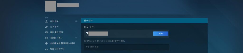 세이브파일 경로에 접근하기 위해서는 자신의 코드를 알아야 합니다. 코드는 스팀에서 친구창을 띄우신 뒤, ‘+’ 모양을 누르시면 위처럼 친구 페이지로 넘어가게 됩니다. 이 때 사진처럼 나타나는 ‘친구 코드’가 자신의 코드입니다.