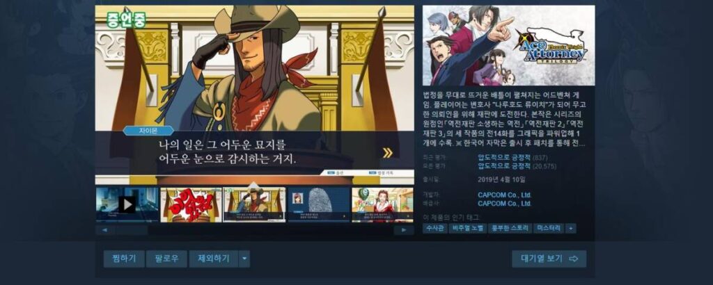 자, 오늘은 스팀 세일 기간에 있는 역전재판에 대해서 소개를 해보려고 합니다. 2001년 10월에 첫 시리즈가 등장하면서 전세계에서 뜨거운 반응이 있었는데요. 이후에 발매된 두 번째, 세 번째 시리즈도 역시나 큰 사랑을 받았습니다. 그리고 오늘 소개할 본 게임은 세 가지 작품의 그래픽을 재구성하여 새롭게 다듬은 ‘트릴로지’인데요. 이 시리즈도 마찬가지로 엄청난 인기를 끌고 있는 것으로 유명합니다.