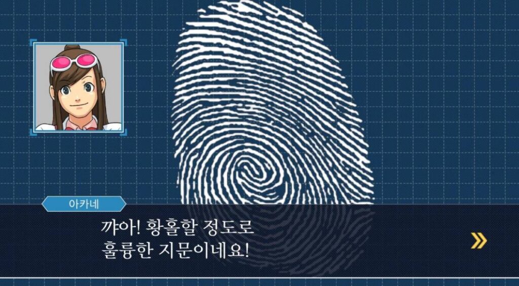 해당 게임은 논리적인 추론을 통해서 변호하고, 증인과 피고인을 심문할 뿐만이 아니라 수사를 하기도 합니다. 수사관이 아니지만 사건이 발생한 현장에 가서 변호에 도움이 될만한 내용들을 수집하게 되죠. 위 사진은 그러한 예시 중에 한 장면인데요. 특정 사물의 부분에서 지문을 채취하여 증거로 제출할 수 있습니다.