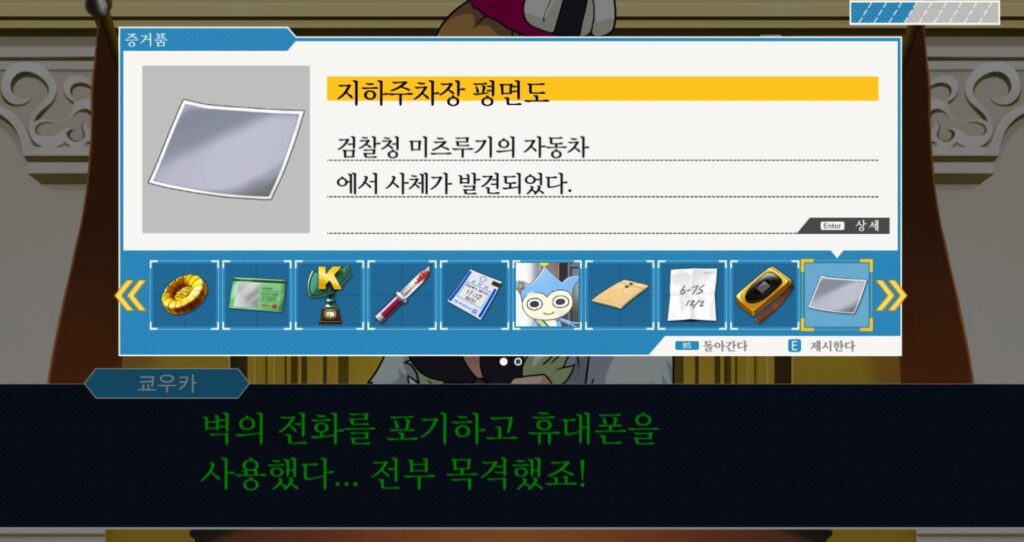 추궁과 공격적인 선택지를 반복하여 평면도 바탕의 증언을 보았다면 이상한 부분을 발견하셨을 것입니다. 만약 제대로 체크하셨다면 쿄우카의 위 대사는 상당히 이상하다는 것을 알 수 있죠.