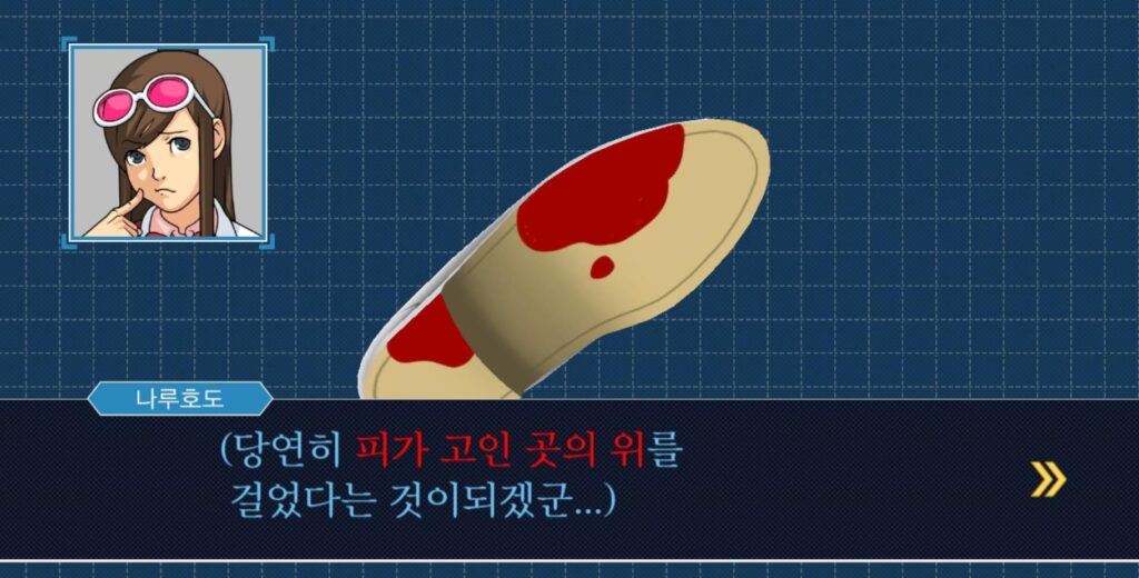 쿄우카의 거의 모든 위증을 쳐냈는데도 불구하고 계속해서 진행되는 사건 때문에 아마 이쯤 되었을 때 지치셨을 것 같아요. 하지만 꼼꼼함만 있으면 금방 하실 수 있습니다. 쿄우카가 제출한 ‘구두’의 아랫 부분을 조사해주신 뒤 진행하면서 문제를 지적하시면 됩니다.