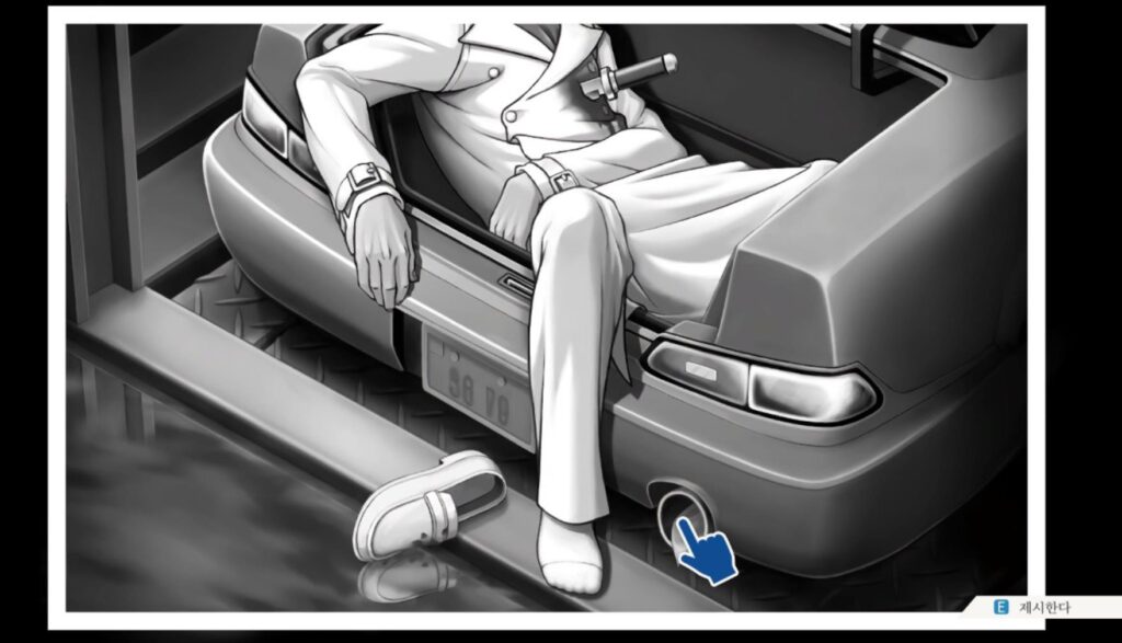 문제를 지적하겠다고 하면 위처럼 현장 사진 어느 부분에 문제가 있는지를 선택하게 되는데요. 여기서 거의 기믹처럼 사용된 ‘머플러’가 마지막 실마리가 됩니다. 계속해서 ‘머플러’ 이야기가 나왔지만 쓰이지 않은 탓은, 마지막 사진의 결정적인 단서가 되기 위함이었습니다.