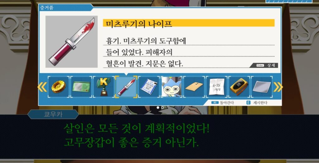 범죄의 계획성에 대해서 논의가 될 때 위 대사가 나타난다면 미츠루기의 나이프를 제시하시면 됩니다. 쿄우카가 ‘장갑’을 가지고 피의자의 계획성을 공격하려는 시도이지만, 생각해보면 말이 안되죠. 계획성이 있다면 토모에 본인의 나이프를 사용했을 것이기 때문입니다.