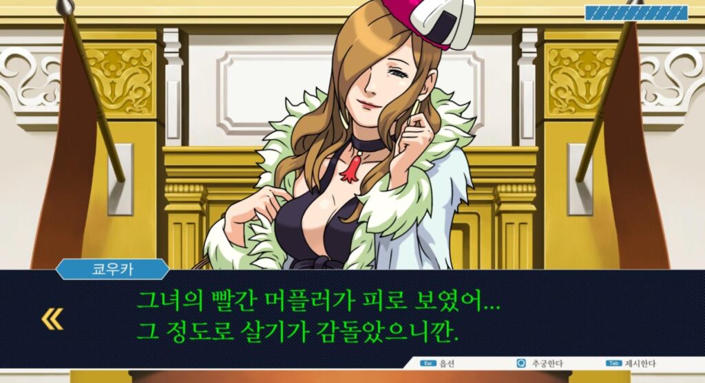 2일차 법정 전편에서는 쿄우카의 증언이 진행되는데 완벽한 듯 하면서도 이상한 느낌을 자주 느끼실 수 있습니다. ‘악의’가 있는 게 뚜렷하죠.