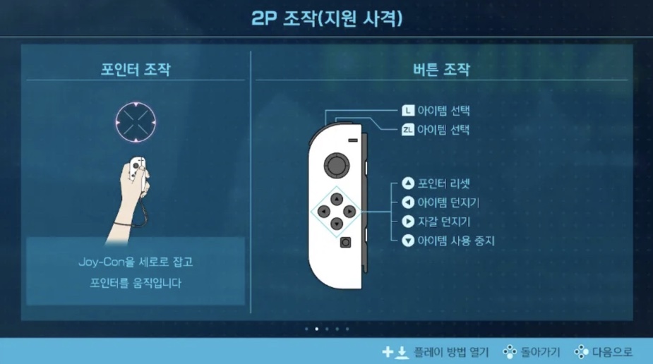 2명이 각각 역할을 도맡아 플레이하는 방식이 아니라, 1P가 메인으로 플레이를 진행하면 2P는 조이콘을 세로로 잡고 포인터 조작으로 아이템 선택, 사용 중지, 아이템 던지기, 자갈 던지기 등 보조 역할을 담당하게 됩니다. 2P의 지원사격으로 원주생물을 함께 공격하면 버거운 원주생물이라도 훨씬 더 수월하게 쓰러뜨릴 수 있죠.