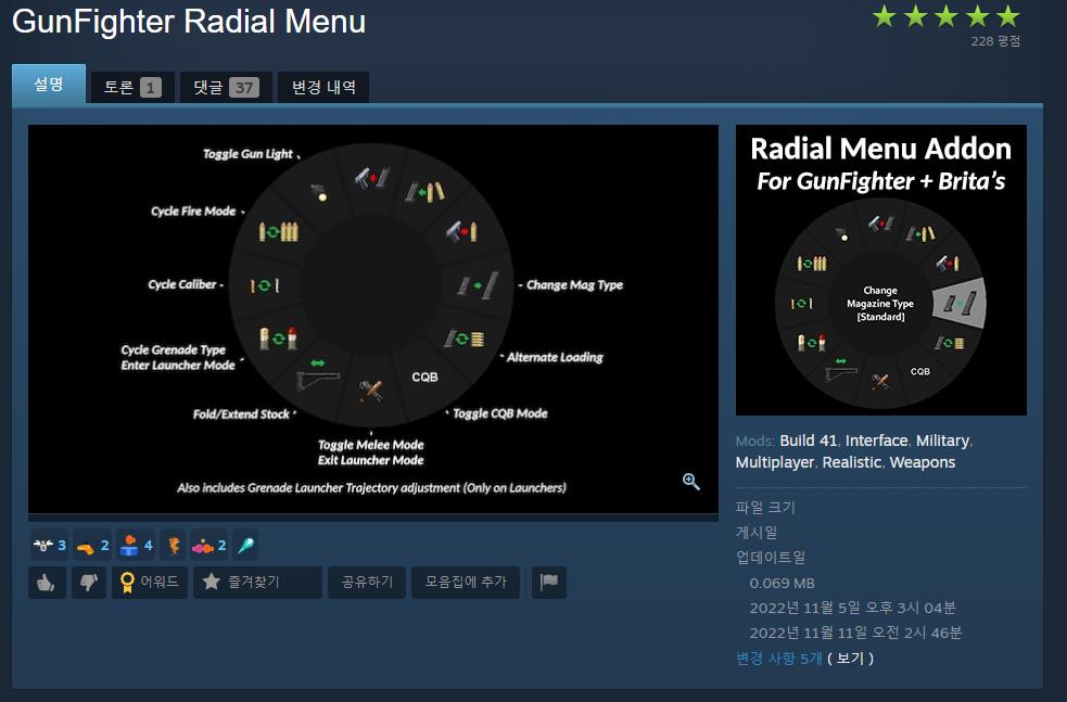 이처럼 아르세날 건파이터 모드와 브리타 모드를 사용하다 보면 사소하지만 빈번한 실수로 인해서 게임에 지장이 가는 경우가 굉장히 많습니다. 따라서 GunFighter Radial Menu 모드는 굉장히 유용하다고 볼 수 있습니다. 이런 식으로 유저의 게임플레이를 개선해주는 모드를 보통 QOL 이라고도 하는데요. 편의성을 제공하는 형식의 모드들은 QOL 을 검색 키워드로 놓고서 찾아본다면 다른 유용한 모드들도 접해보실 수 있습니다.