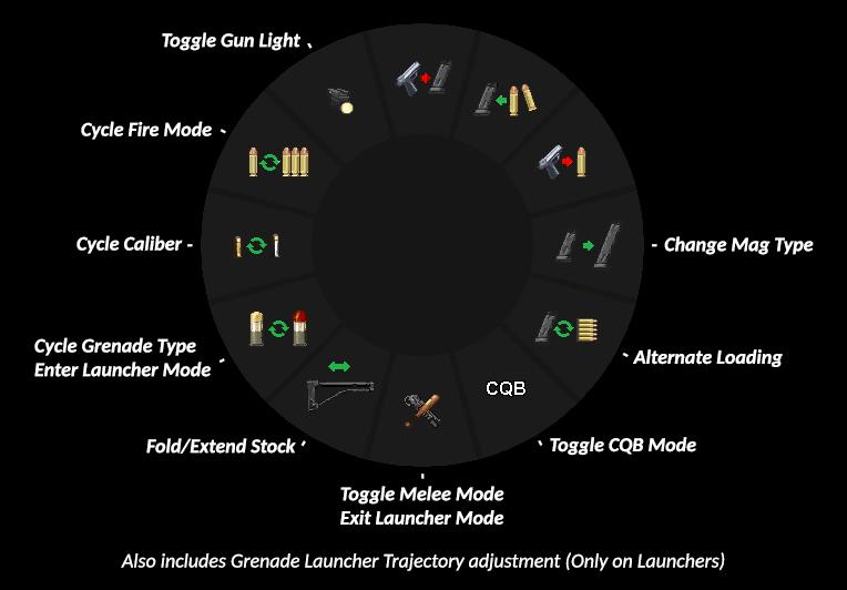 위 화면은 모더가 예시를 위해서 모든 메뉴를 나열한 형태입니다. 그렇기 때문에 캐릭터가 어떠한 무기를 집고 있는가에 따라서 선택할 수 있는 메뉴는 자동으로 달라집니다. 즉, 맥락적인 요소가 자동으로 동반된다고 보시면 되겠습니다. 아울러 메뉴를 불러내는 방법은 기존의 프로젝트 좀보이드 총기 관련 기능 키인 “R” 을 길게 누르시면 됩니다. 그리고 마우스로 원하는 조작을 하시면 끝입니다.