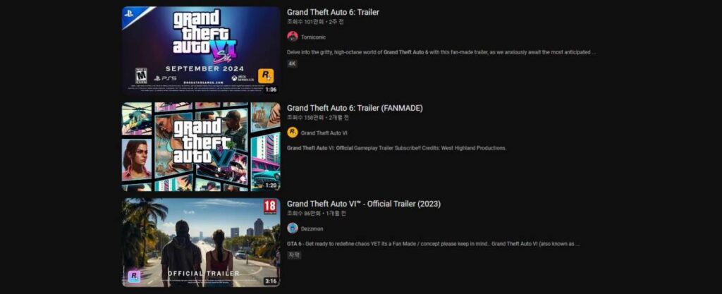 이렇게 좋은 소식이 들려오는 가운데 GTA 6 를 둘러싸고 여러 가지 확인되지 않은 정보들이 매우 많아지고 있는 추세입니다. 현재 트레일러라던가 게임 정보를 다루고 있는 영상들과 글이 많은데요. 이러한 것들은 대부분이 가짜 뉴스에 해당합니다. 보통 조회수나 뷰를 통한 광고 수익을 얻기 위한 영상 혹은 글들인데요. 우리가 일상생활에서 흔하게 사용하고 있는 유튜브만 보더라도 벌써 GTA 6 트레일러나 인게임 플레이 영상이 올라왔다는 거짓 정보를 접할 수 있습니다.