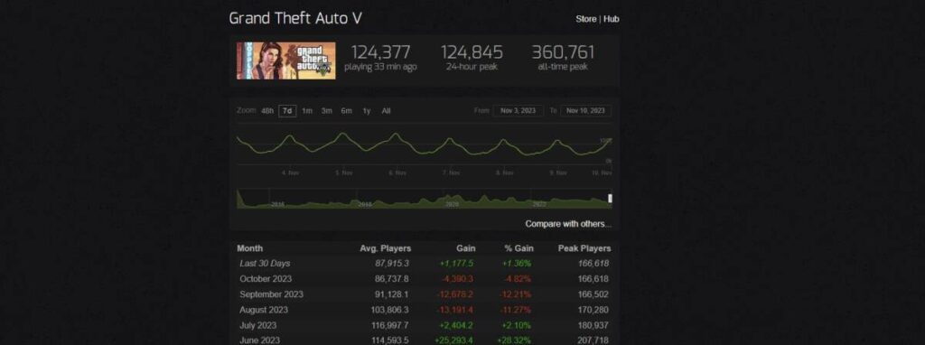 앞서 언급하였듯 GTA 5 는 엄청난 성공을 거두면서 현재까지도 업데이트 되고 있을 정도로 큰 사랑을 받고 있습니다. 하여, 플레이 하는 유저들도 대단히 많은 것으로 나타나있는데요. 아직 GTA 6가 어떠한 모습으로 나타날지에 대해서는 추측만 난무하고 있는 상황이지만, 여지껏 락스타 게임즈가 보여줬던 성공 시나리오들을 보면 GTA 6 또한 붐을 일으키면서 전세계 최다 유저를 일시적으로 모으지 않을까 기대하고 있습니다.