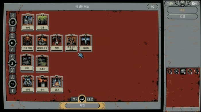 야영지에서 ‘돌아간다’ 를 선택하거나 보스를 클리어하면 해당 맵에서의 모험이 종료되며, 모은 재료들로 건축물을 짓고 업그레이드 할 수 있다. 건축물에 따라 특별한 카드가 해금되거나 보급품을 얻을 수 있는 등의 효과가 있으니 지을 수 있는 것이 생기면 빠르게 지어두는 것이 좋다. 피난처를 건설하면 로그 클래스가, 지하묘지를 건설하면 네크로맨서 클래스가 해금되는데, 두 건물보다 ‘보급소’ 를 먼저 건설해 보급품을 챙기면 게임 진행이 좀 더 쉬워진다.