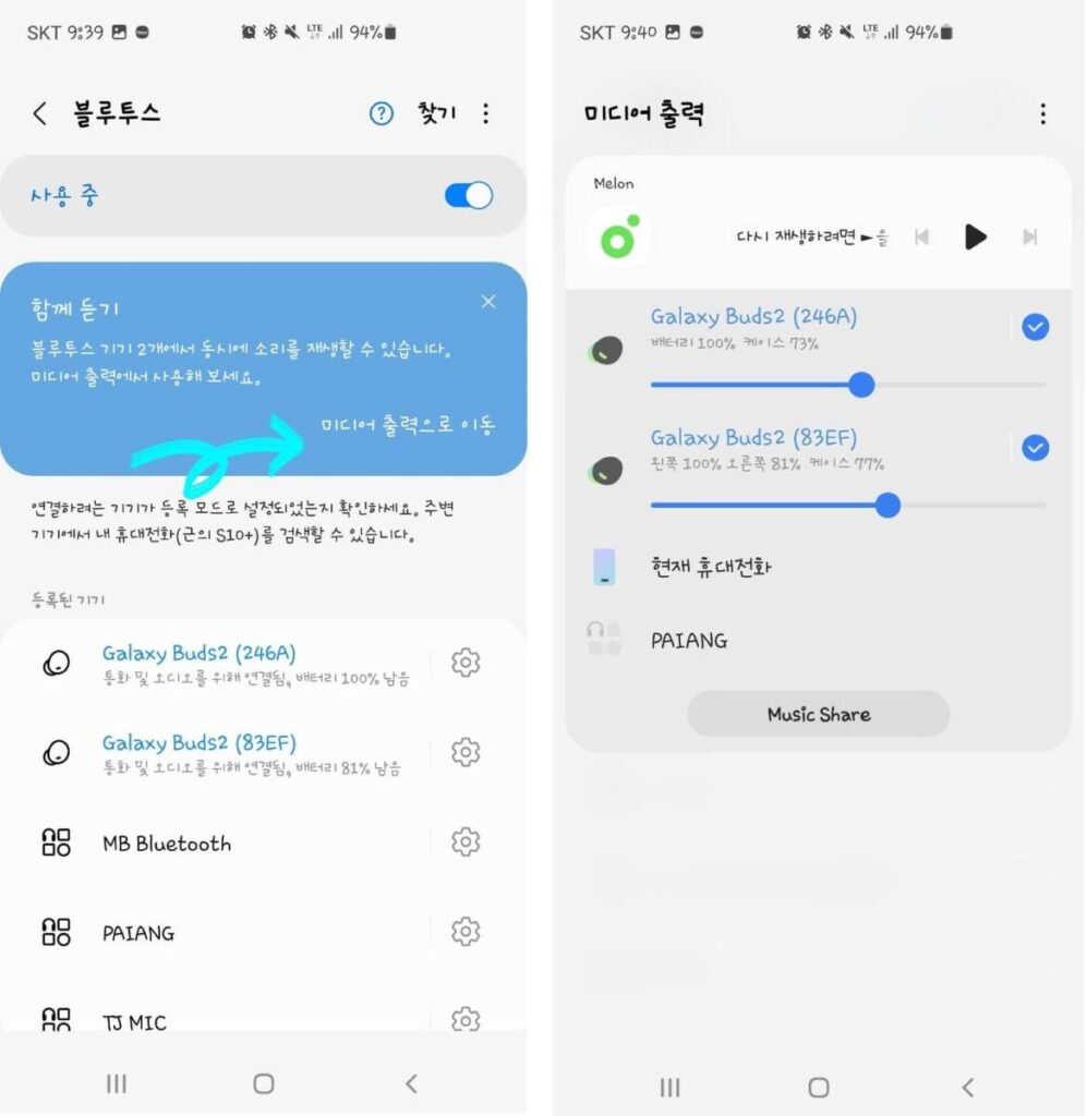 연결이 됐다면 블루투스 찾기 버튼을 눌러 두 번째 이어폰을 연결한다. 그러면 왼쪽 화면처럼 두 개의 이어폰이 모두 연결되고 함께 듣기라는 알림이 뜨게 된다. 화살표로 표시한 것처럼 미디어 출력으로 이동을 누르고 두 이어폰의 볼륨을 조절하면 듀얼오디오 기능을 사용할 수 있다. 자주 활용하는 기능은 아니지만 친구나 연인들끼리 유용하게 활용할 수 있으니 기억해두자.