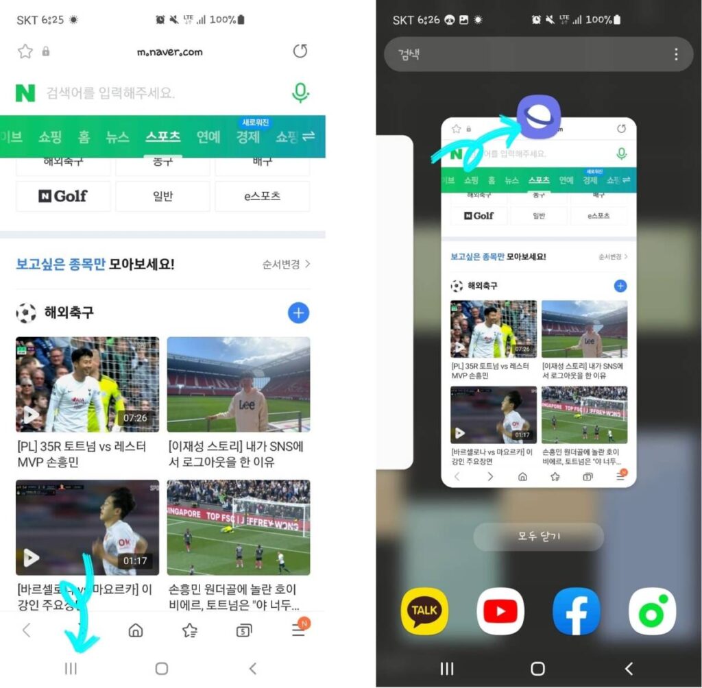먼저 가장 하단 메뉴 왼쪽의 실행중인 앱 보기 아이콘을 눌러준다. 그러면 전에 실행했던 앱들이 순서대로 화면에 나열된다. 그리고 화살표로 표시된 상단 아이콘을 길게 눌러준다.