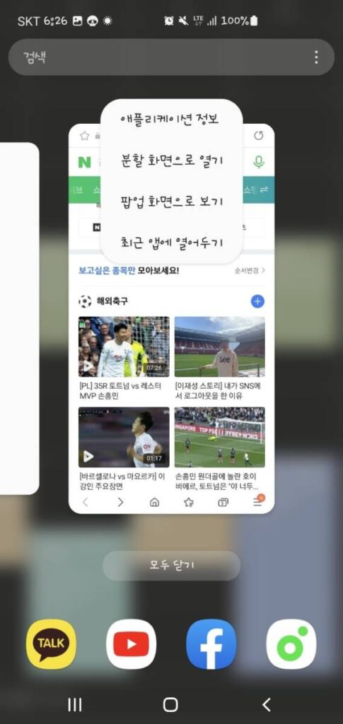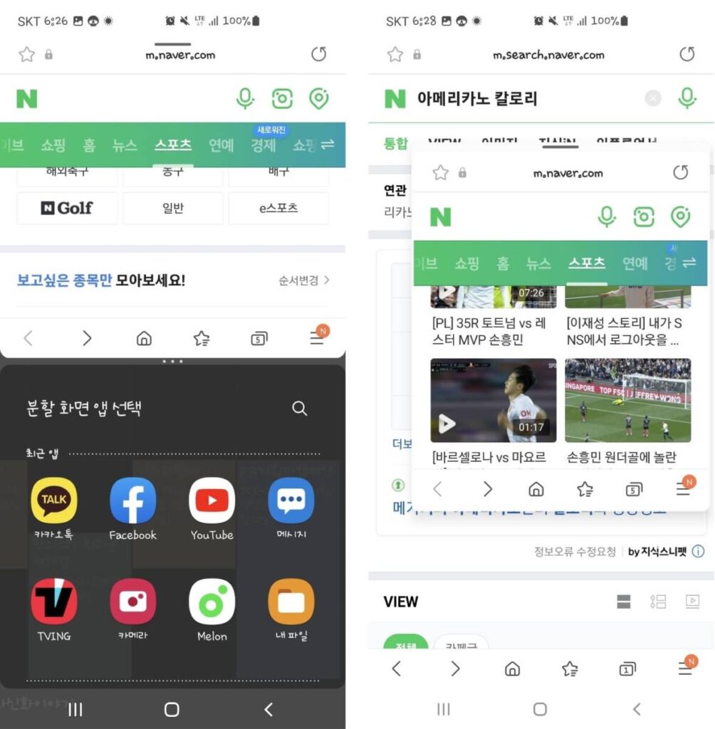 예를 들어서 분할화면으로 열기를 선택하면 왼쪽처럼 두개의 앱을 동시에 실행할 수 있고, 팝업화면으로 보기를 선택하면 오른쪽처럼 앱 위에 작은 팝업 화면으로 다른 앱을 실행할 수 있다. 필자는 보통 분할화면으로 열기를 통해 카톡과 동영상을 동시에 이용하는 경우가 많아 정말 유용하게 사용하고 있는 기능이다.