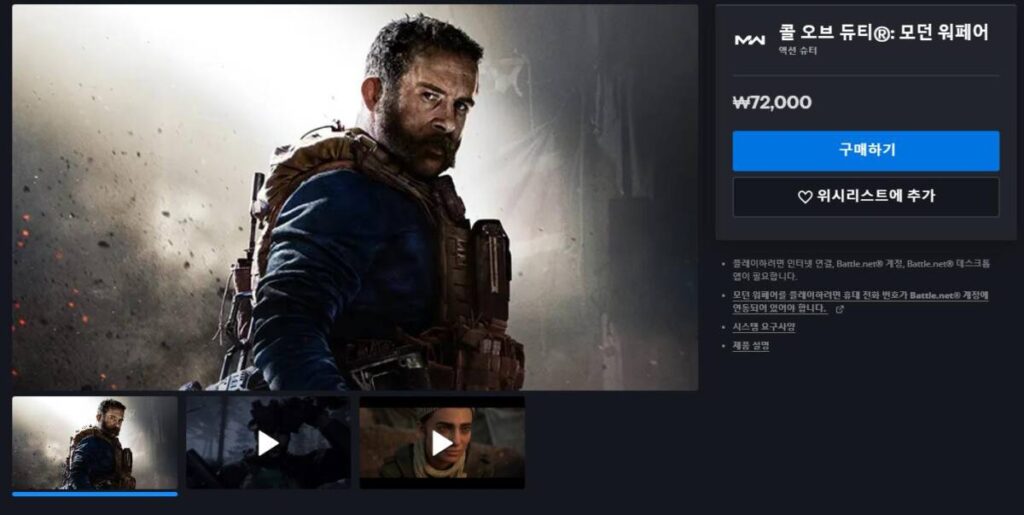 배틀넷에서 판매되고 있는 콜 오브 듀티 모던워페어