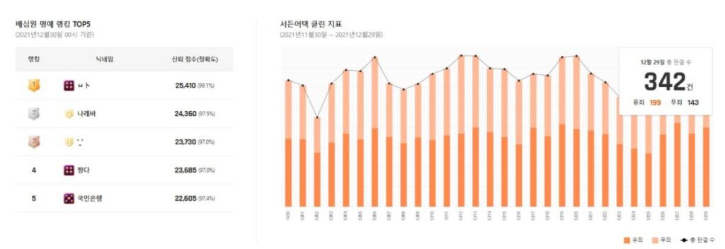 위 사진은 클린 지표라고 하는 것인데요. 특정한 기간동안 얼마 만큼의 판결 수가 있었는지와 유죄, 무죄 판결이 났는지에 대해서 보여줍니다. 게다가 배심원의 랭킹도 보여주기 때문에 이는 지식인의 랭킹을 연상케 하네요. 배심원 판결 내리는 맛에, 게임 플레이보다 배심원 하려고 게임 하는 분들도 있을 것 같아요.