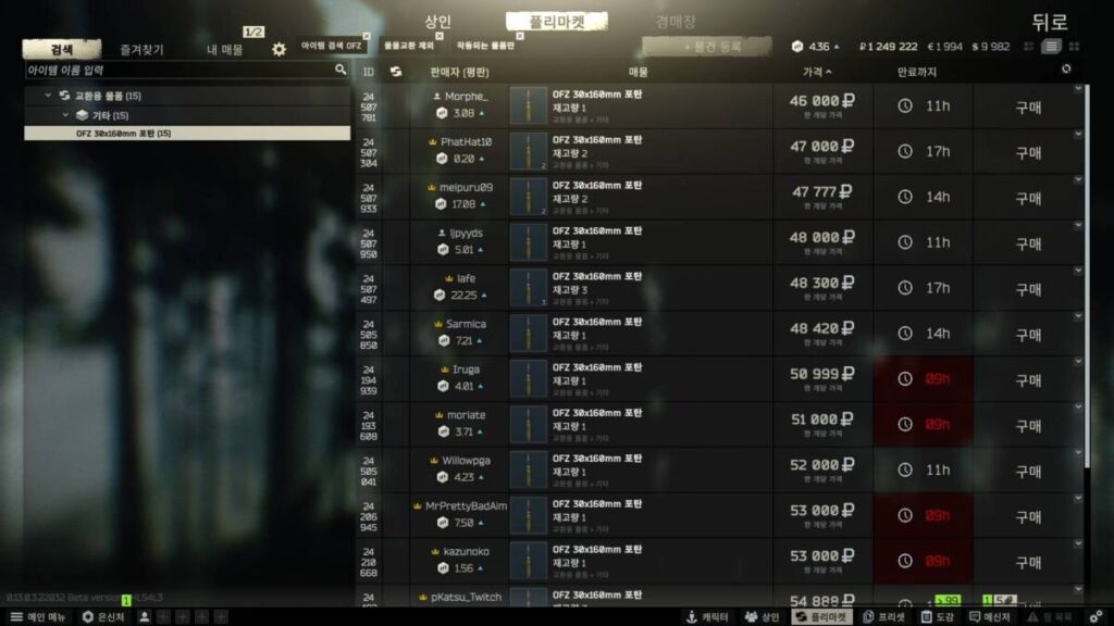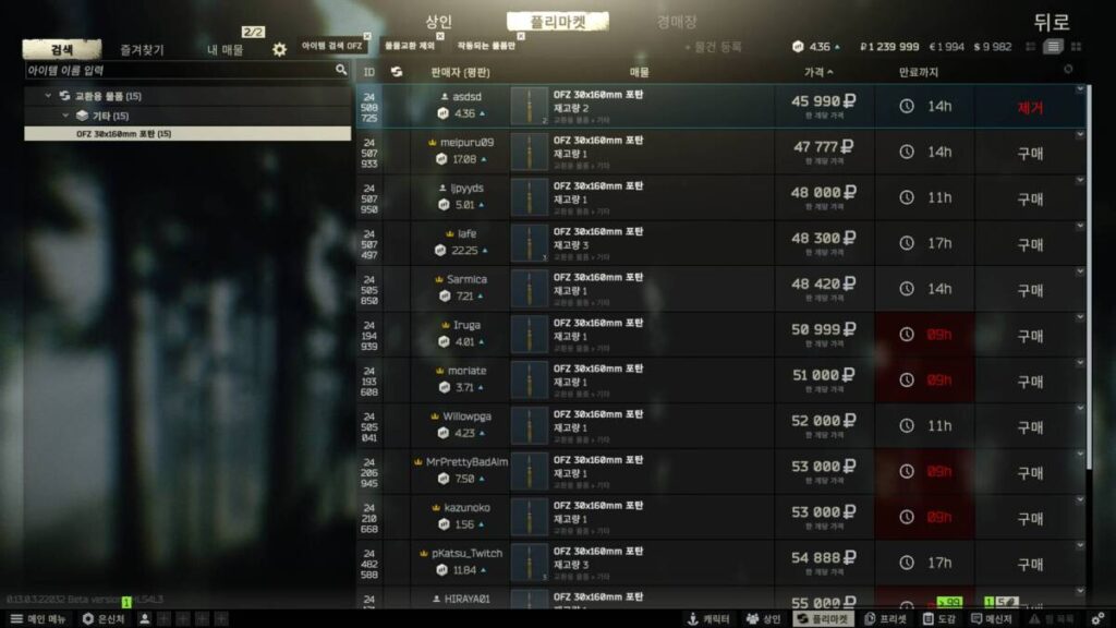 최저가 설정을 할 때에 또 한 가지 주의해야할 점은 새로고침을 하면서 현재 시세를 계속해서 확인하는 것입니다. OFZ의 당시 평균 가격이 5만 루블이었음에도 불구하고 새로고침을 하지 않아서 시세보다 많이 낮게 올리고 말았습니다.