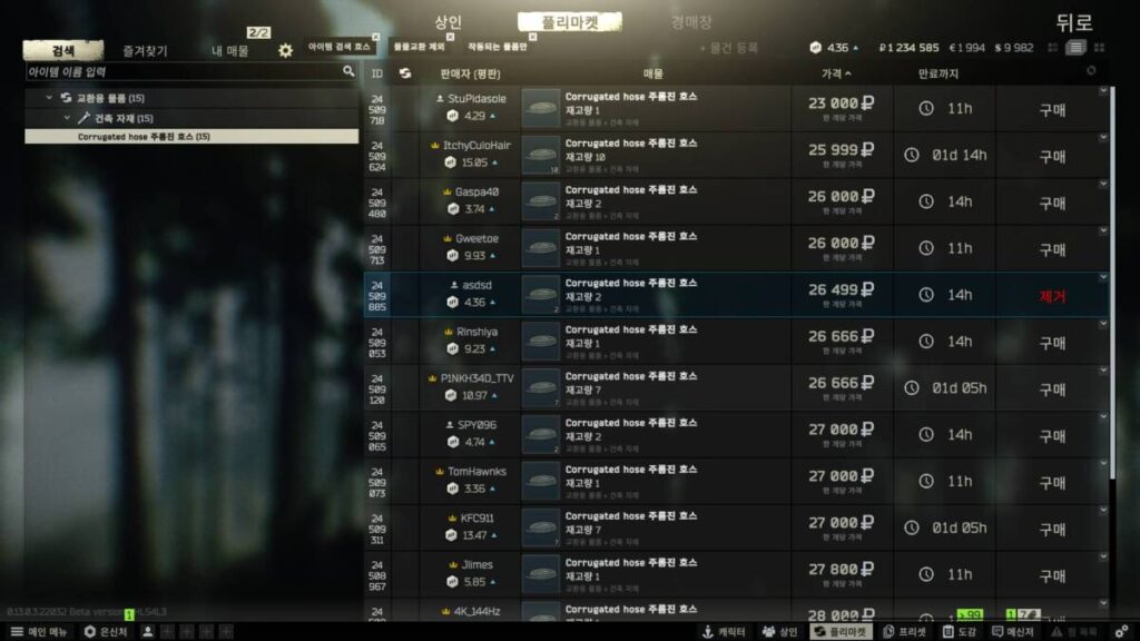 현재 사진상의 주름진 호스는 평균적으로 3만 루블에 가까운 금액에 거래되고 있는 것을 보실 수 있습니다. 이 때 급전을 목표로 하시는 분들은 당연히 최저 가격인 26,499루블 혹은 26,399루블에 올리시는 것이 좋겠죠? 하지만 가격을 설정한 뒤에도 반드시 새로고침을 해주어야 합니다. 그렇지 않을 경우에는 앞서 설명하였듯 공급량에 의해서 후순위로 밀려날 여지가 있기 때문입니다.